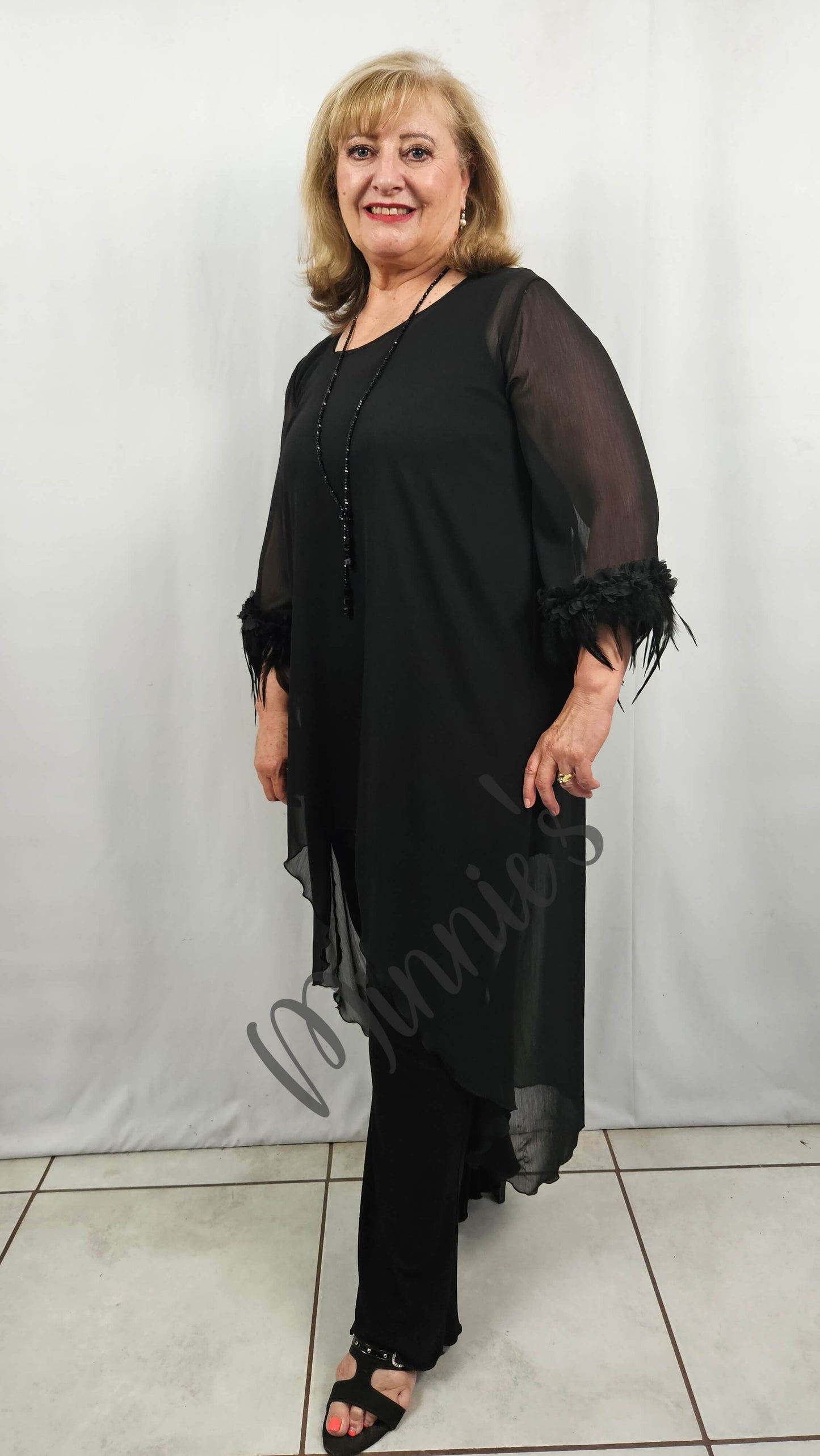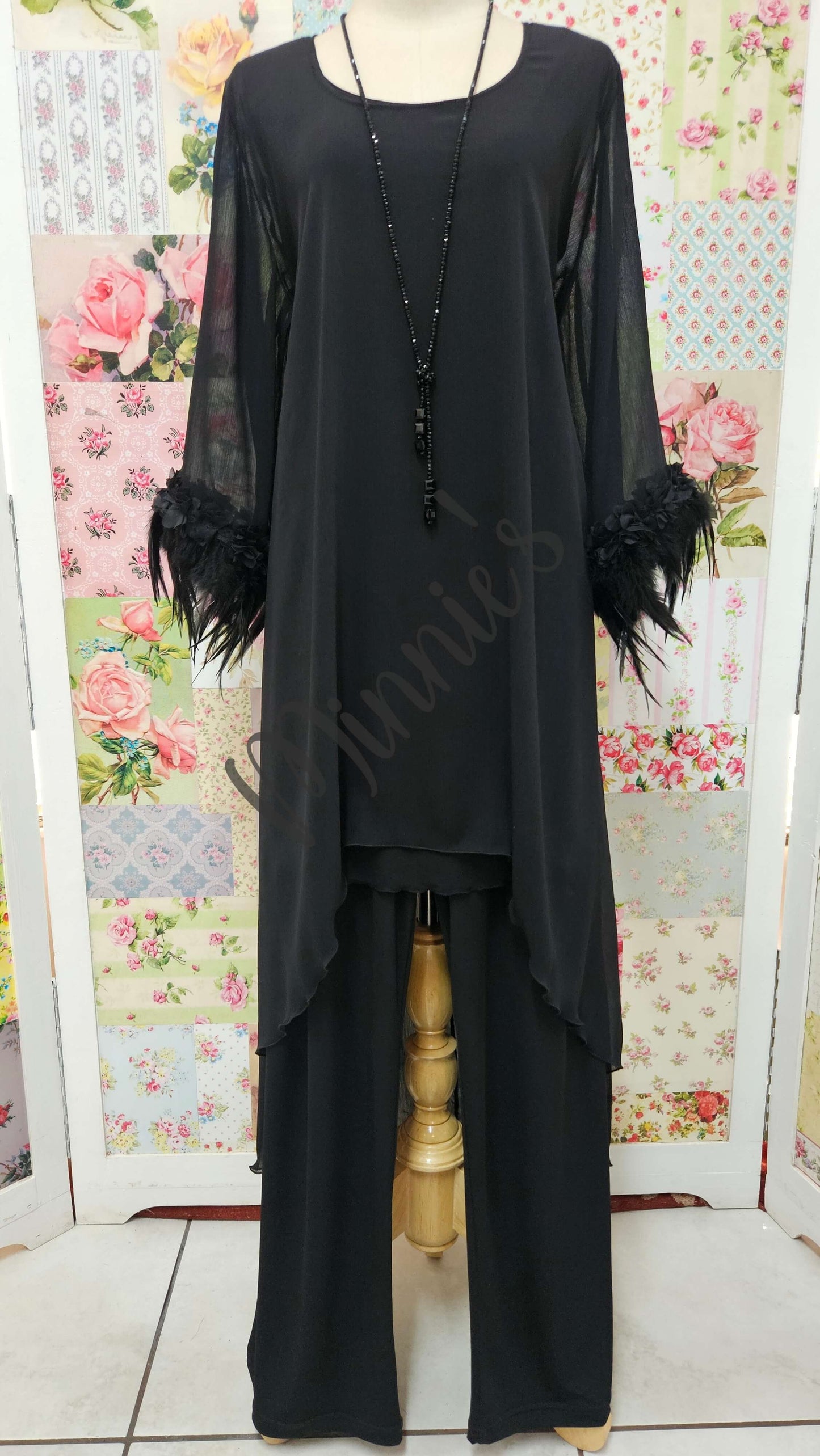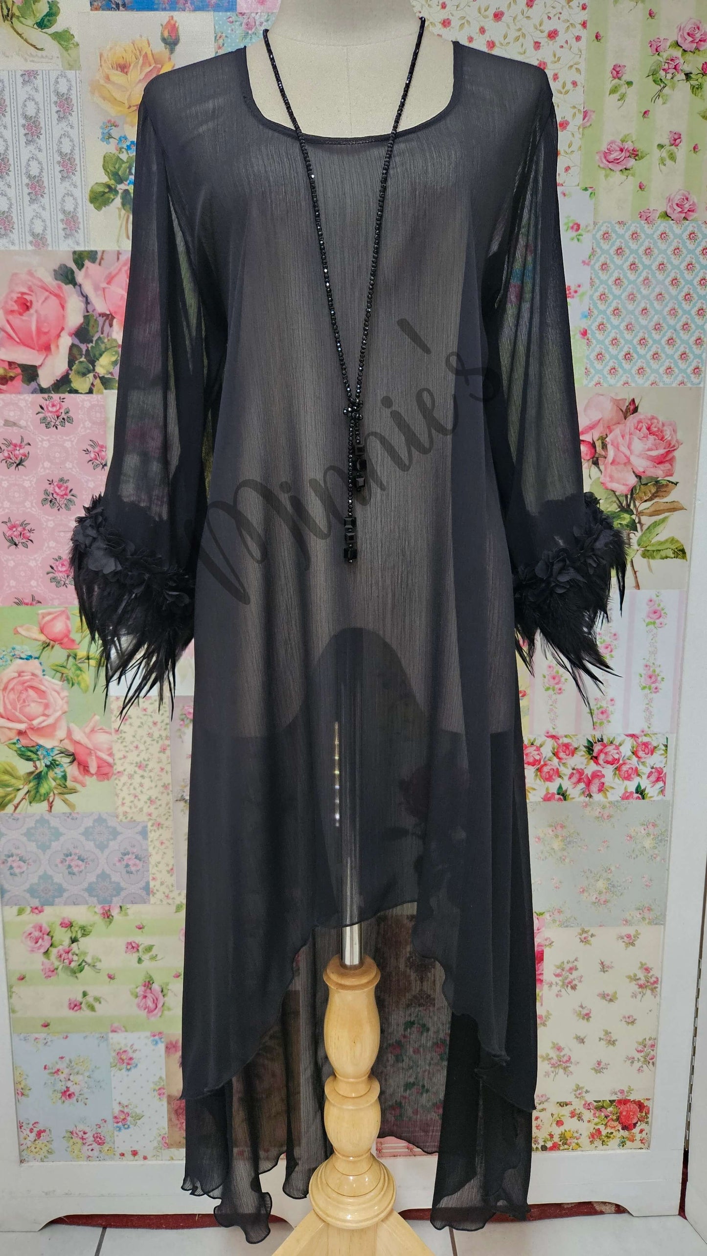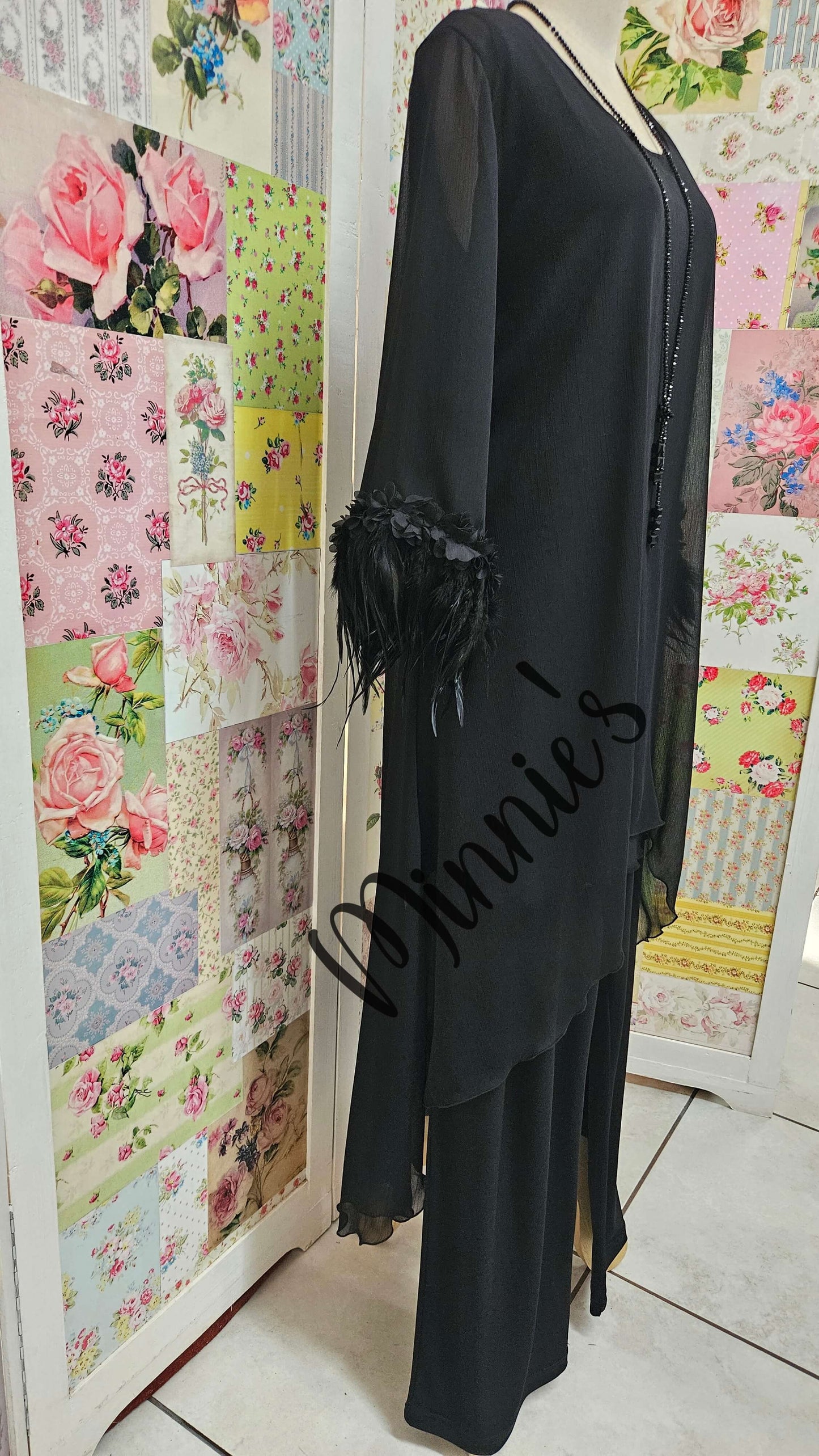 This beautiful and unique black chiffon top features delicate feather details around the sleeves. Perfect for any special occasion or a wedding, it adds a touch of elegance and sophistication.