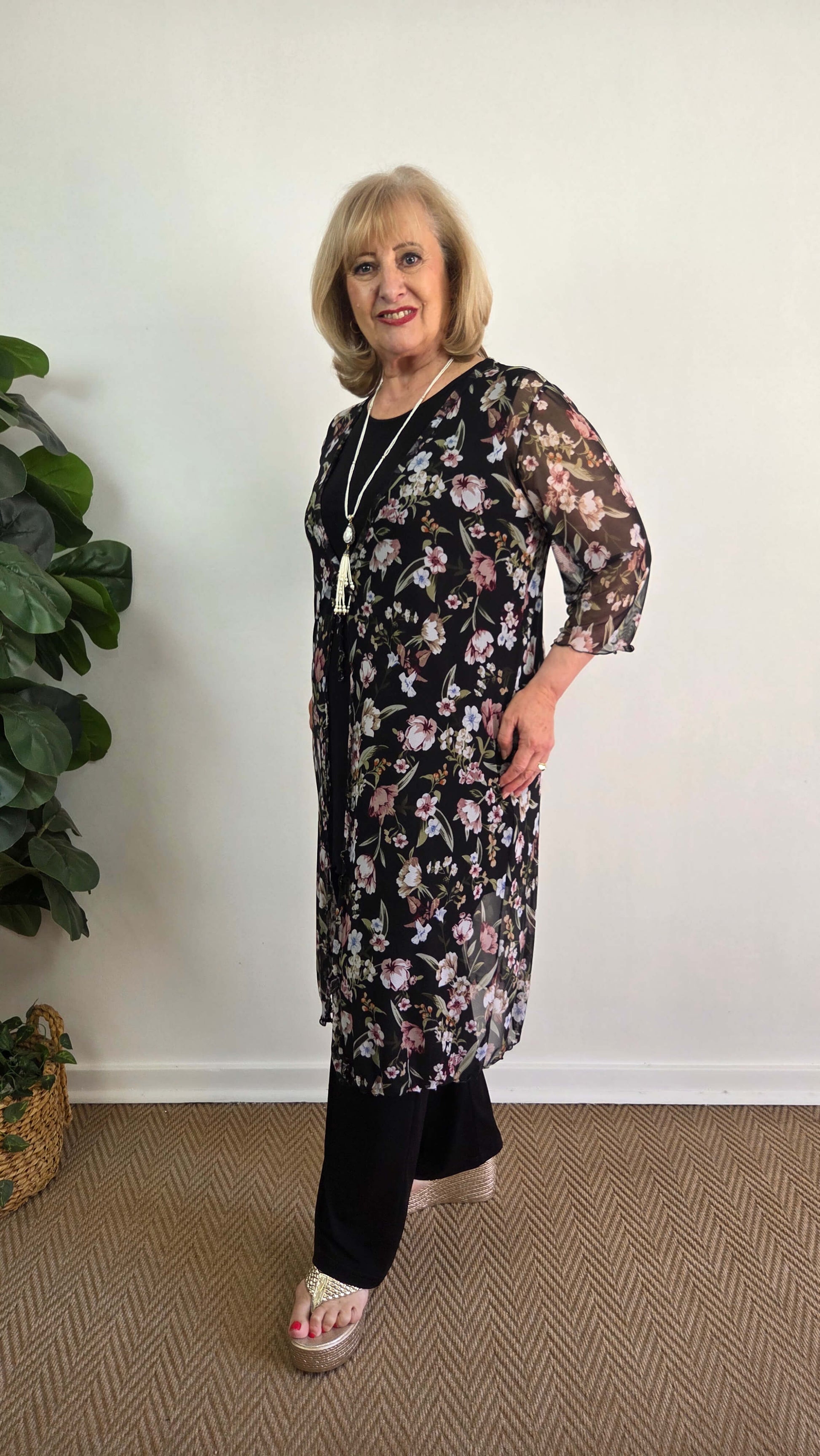 Elevate your outfit with this elegant black mesh jacket featuring delicate small floral prints. Designed with three-quarter sleeves, it offers a graceful silhouette perfect for special occasions. Lightweight and breathable, this jacket adds a refined layer that complements any dress or ensemble effortlessly.