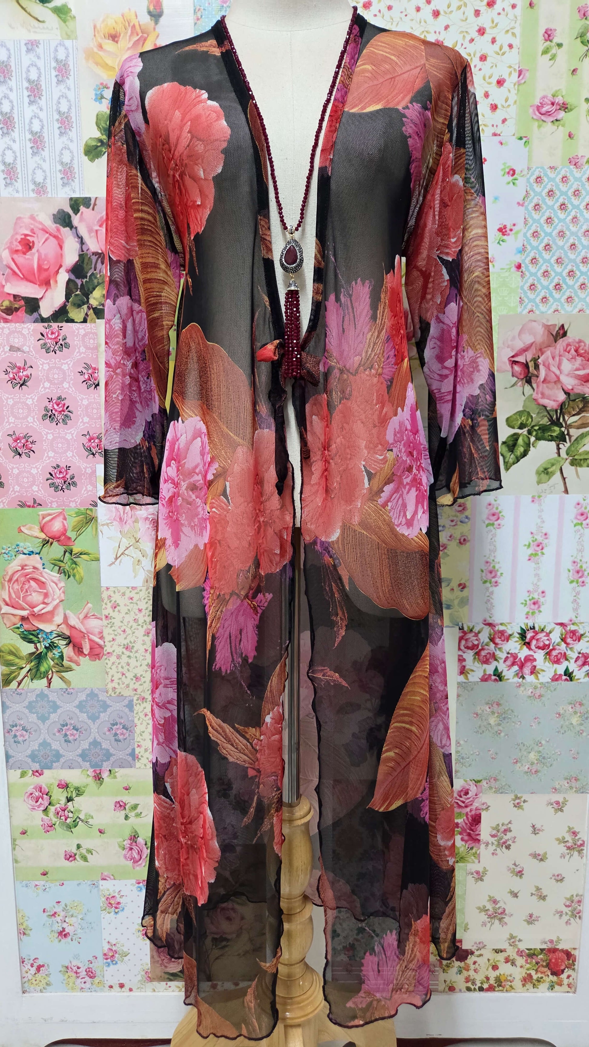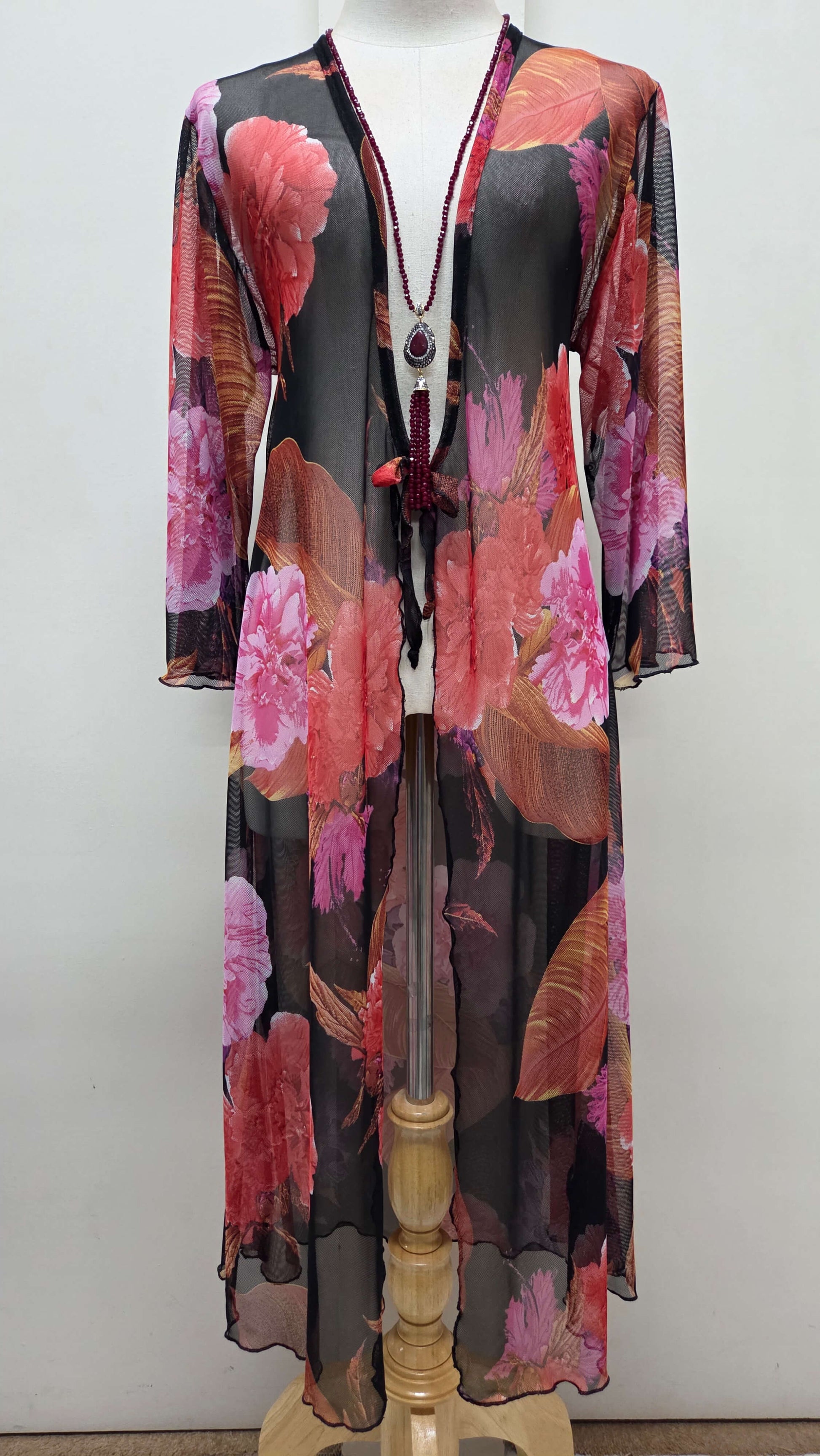 This elegant black mesh jacket features vibrant orange floral prints that create a striking contrast. Designed with 3/4 sleeves, it offers a sophisticated silhouette perfect for special occasions. Lightweight and breathable, it adds a refined layer to your outfit while showcasing exquisite detail and style.