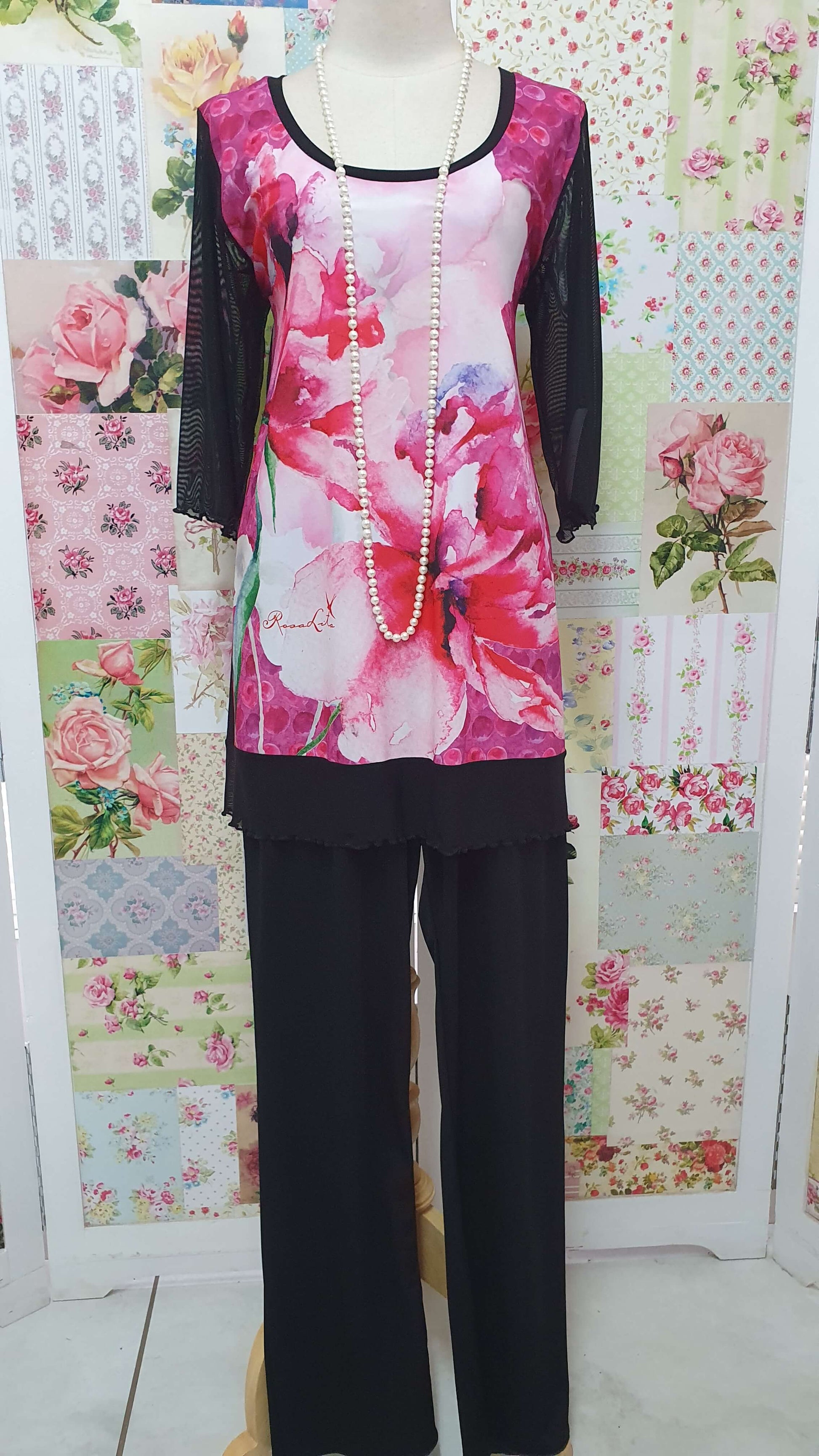- Black bonbon top with cerise pink water color flower print in front and plain black at the back and 3/4 black mesh sleeves.