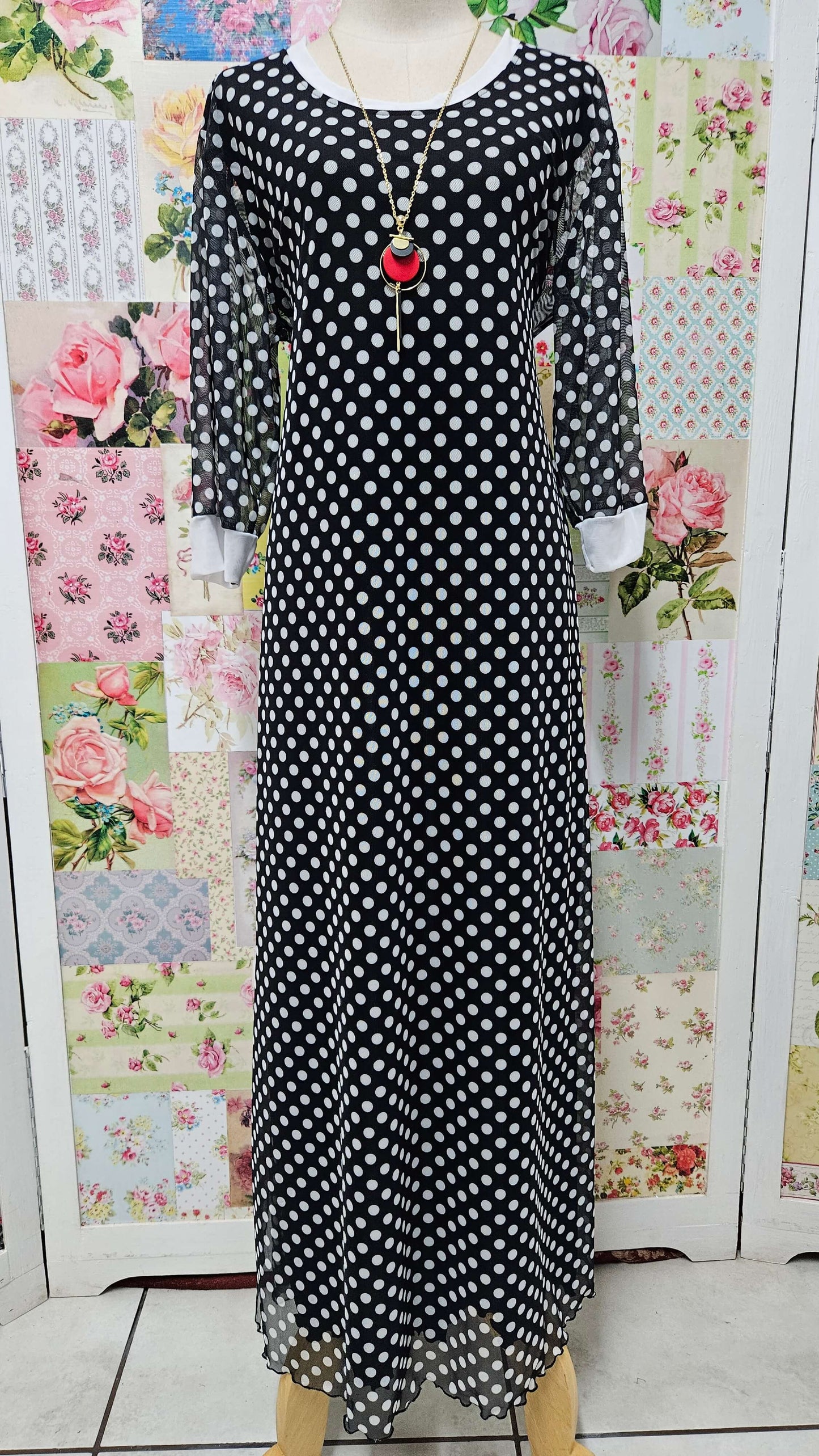 Introducing the Blue & Black 2-Piece Dress LR0104. This stunning dress features a beautiful black and white mesh polka dot pattern, accented by elegant white trimming around the neck and 3/4 sleeves. Perfect for special occasions, add a touch of sophistication to your wardrobe with this versatile and stylish dress.