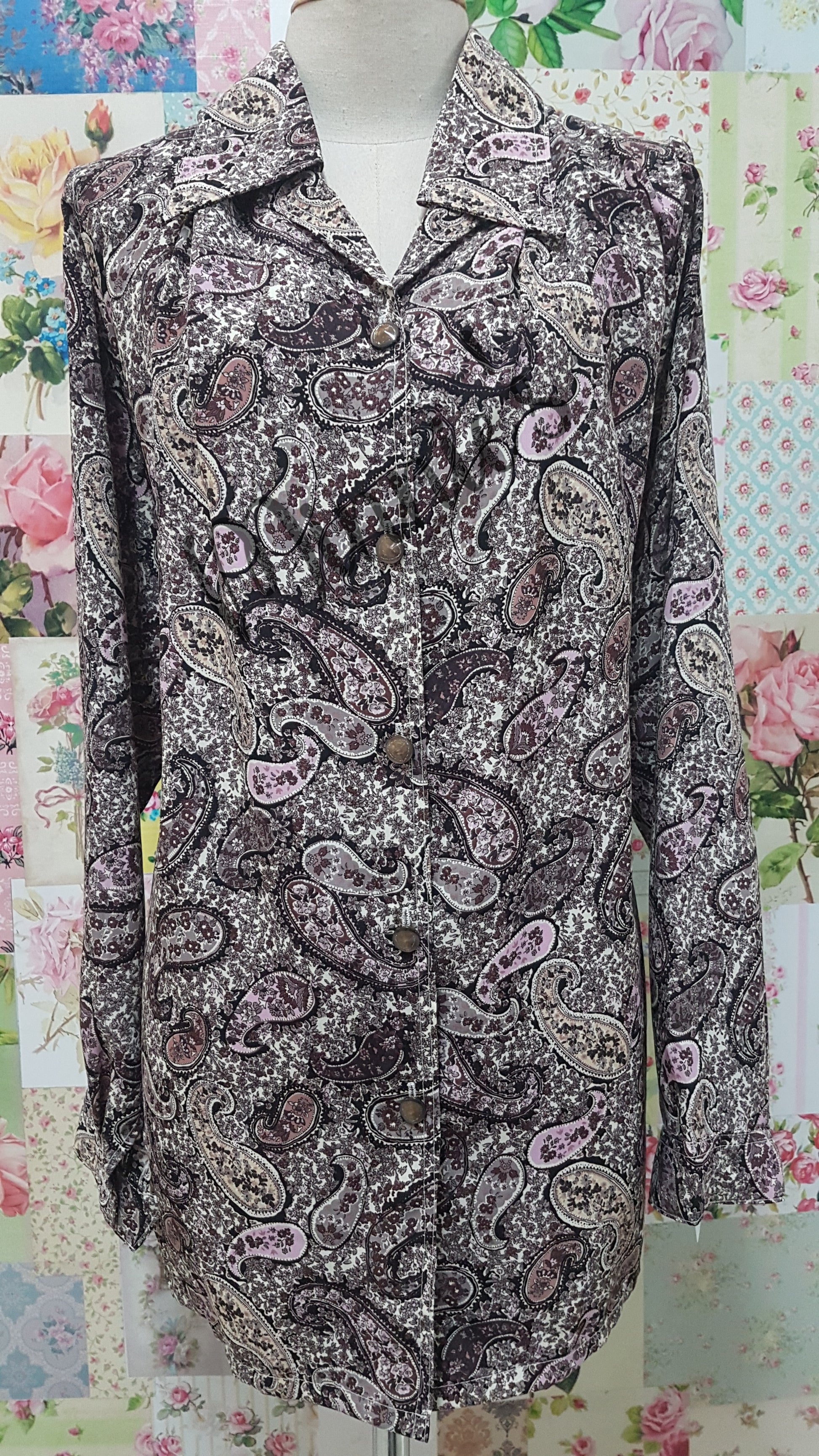 - Chocolate brown, cream and pink paisley printed blouse with long sleeves.