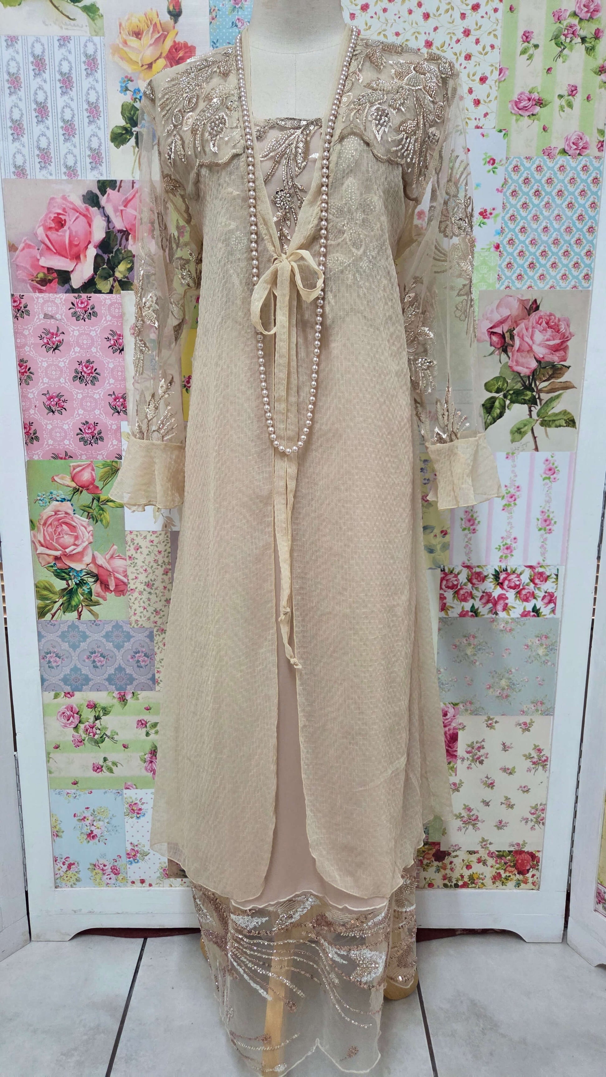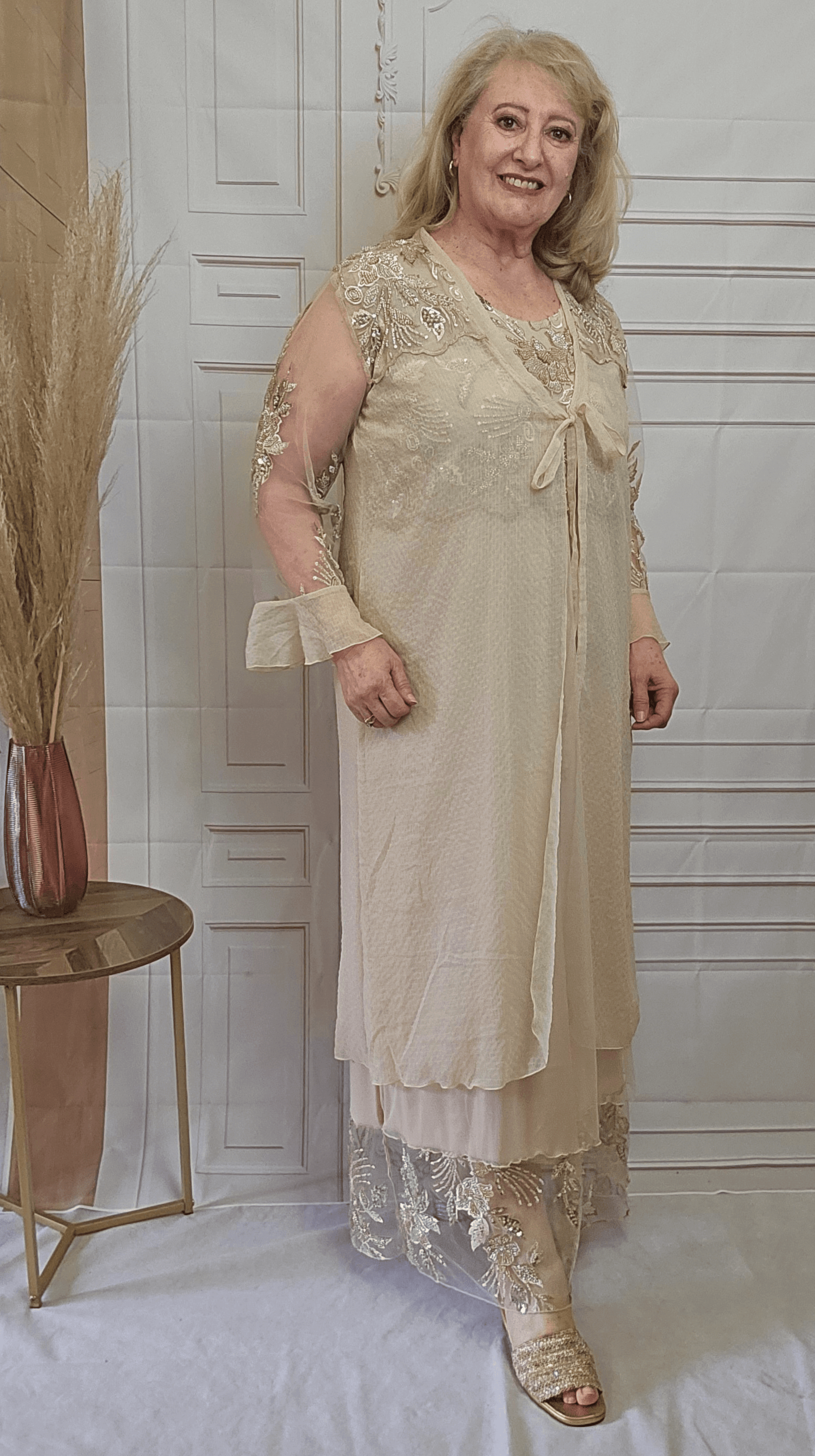 This stylish Champagne Dress Set LR0592 is perfect for special occasions. The bonbon dress features intricate beads and delicate lace for a sophisticated look. The 3/4 sleeve jacket adds an elegant touch. Make a statement and turn heads with this beautiful set.