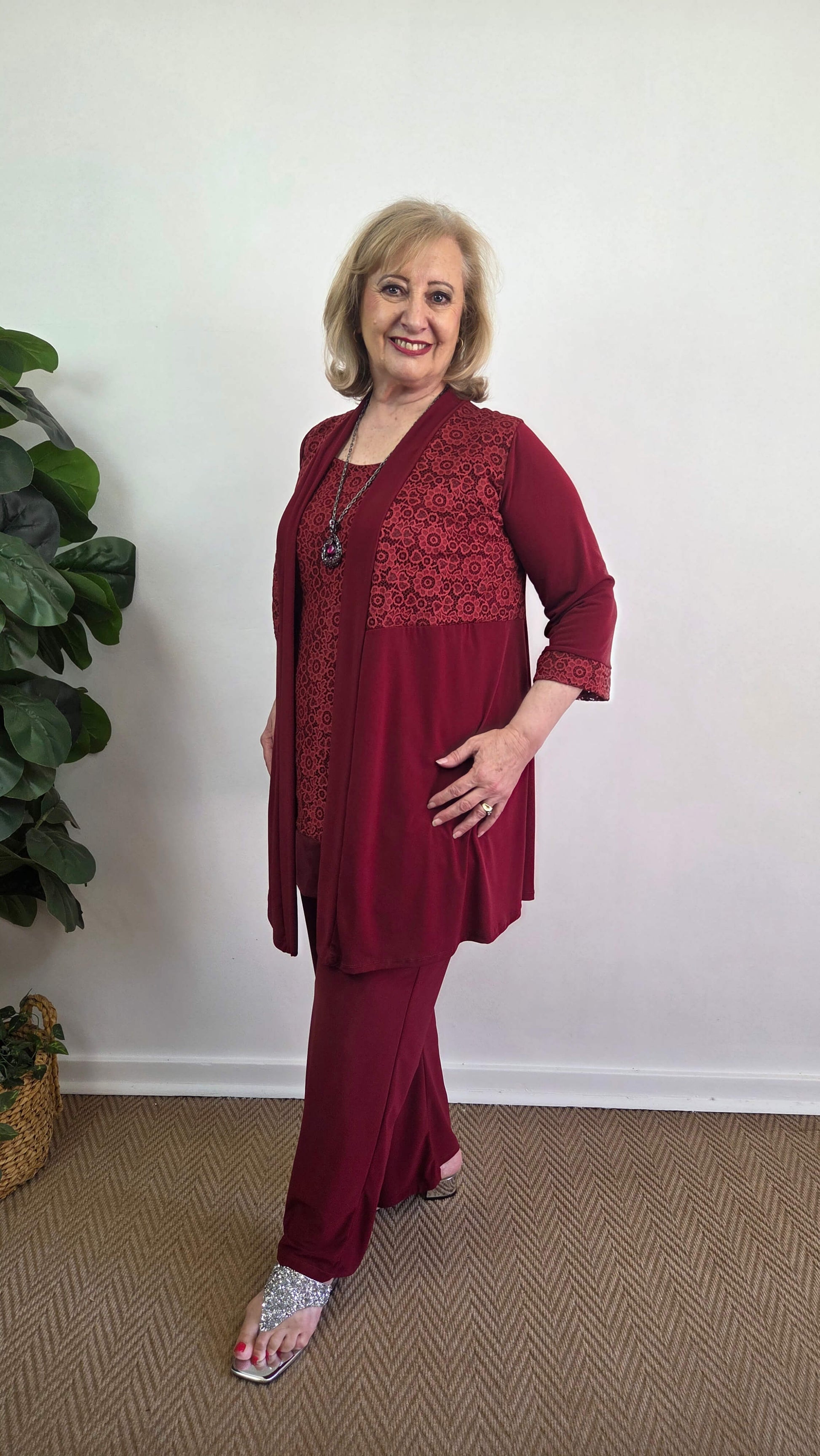 This Maroon 3-Piece Pants Set JS072 features long bonbon pants with an elastic waistband for comfort and ease of wear. The sleeveless camisole combines delicate lace detailing on the front with a smooth bonbon fabric on the back, measuring 83 cm from shoulder to seam for a flattering fit. Completing the set is a maroon bonbon jacket with lace accents on the bodice and elegant 3/4 sleeves, extending 88 cm from shoulder to seam. For longevity, it is recommended to hand wash this sophisticated ensemble.