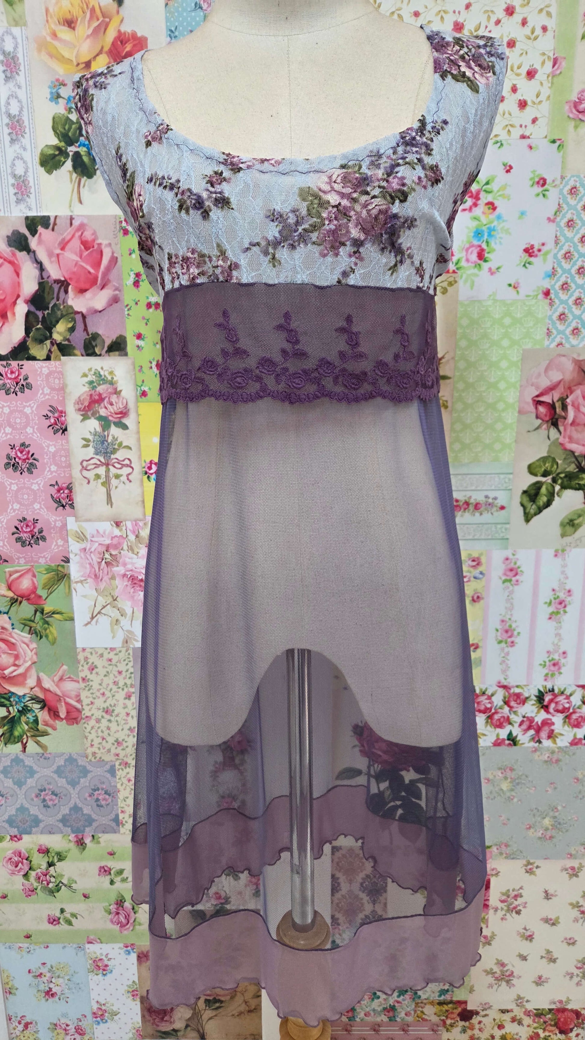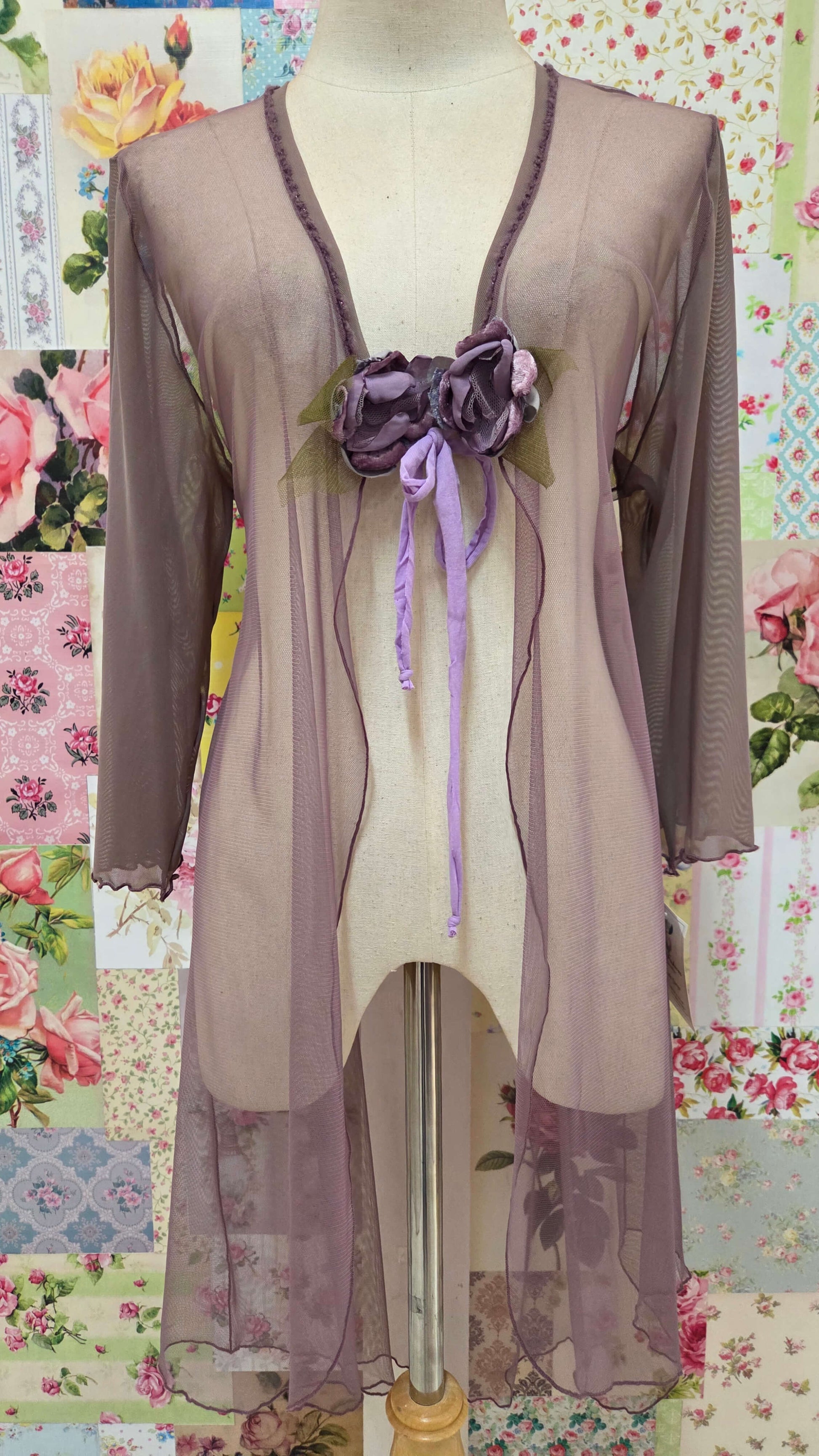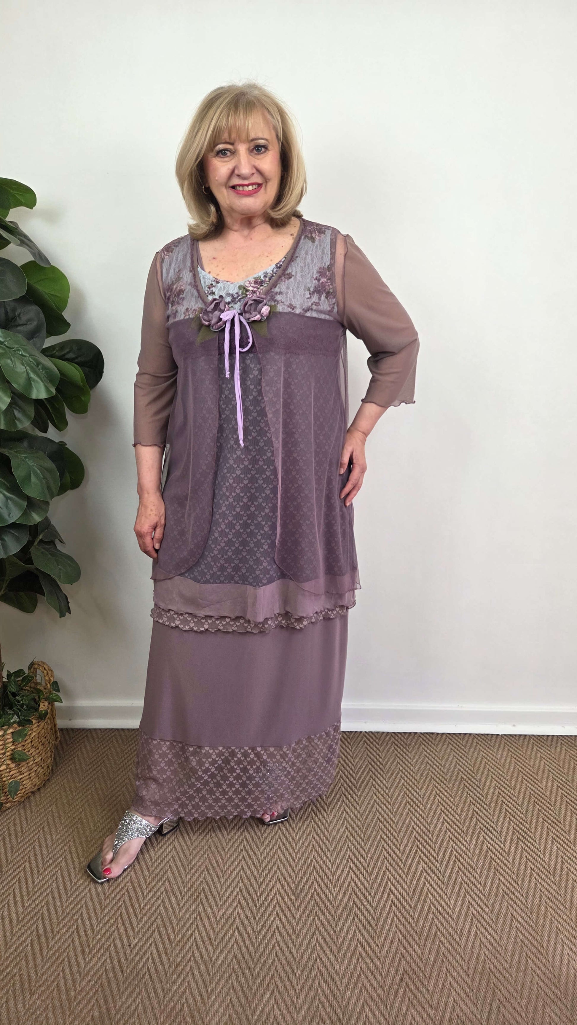This elegant mauve 4-piece dress set features a long bonbon dress detailed with delicate lace trim at the hem. Layered over it is a lace overdress topped by a mesh overdress showcasing a grey printed lace bodice for a refined look. The matching mesh jacket, with 3/4 sleeves, fastens at the front with a subtle bow, adding sophistication and charm. Perfectly suited for weddings and other special occasions, this ensemble combines texture and style for a memorable, graceful appearance.