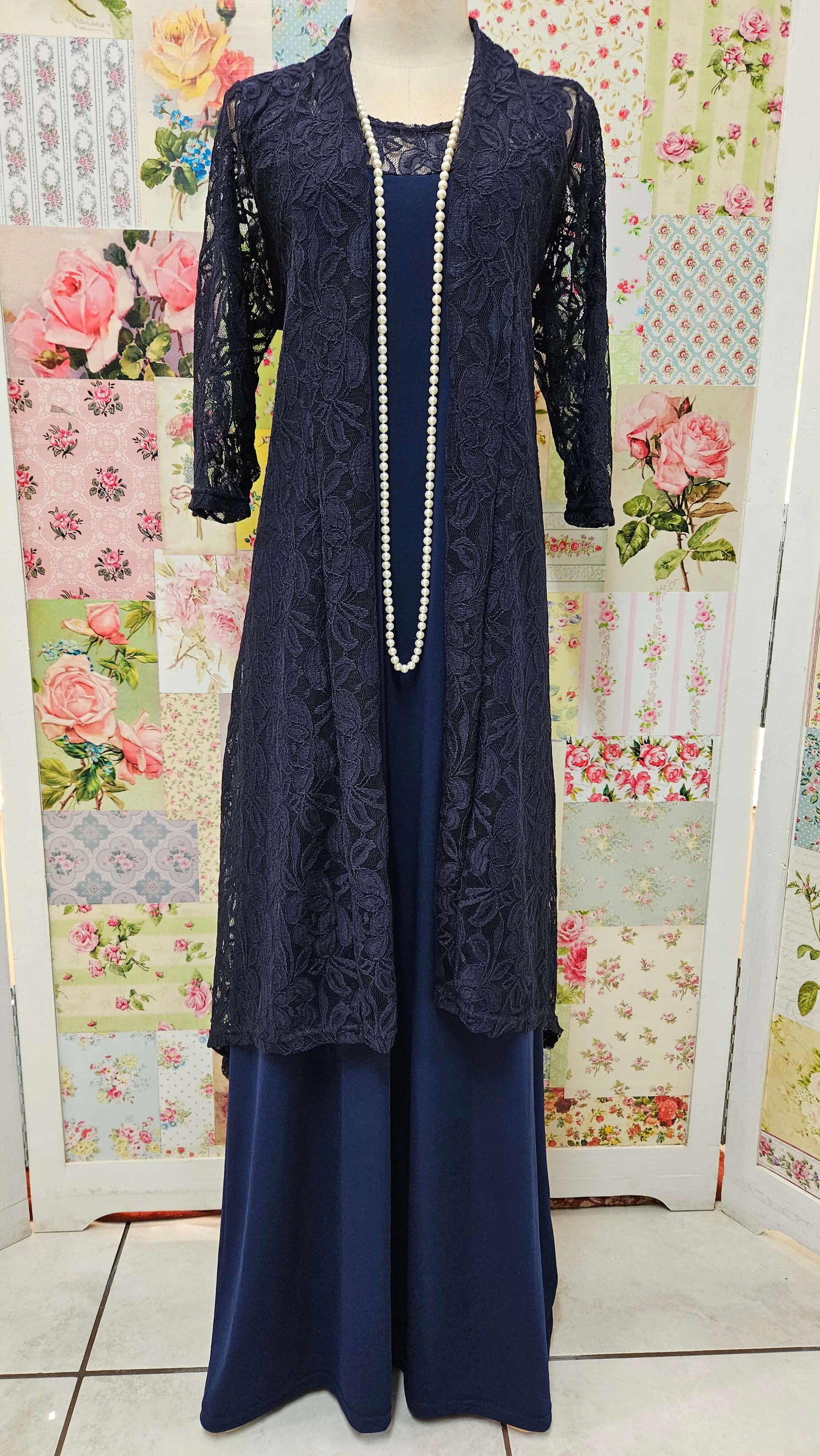 - Dark navy blue sleeveless floral lace gilet with length of 120 cm from shoulder to longest point of seam.