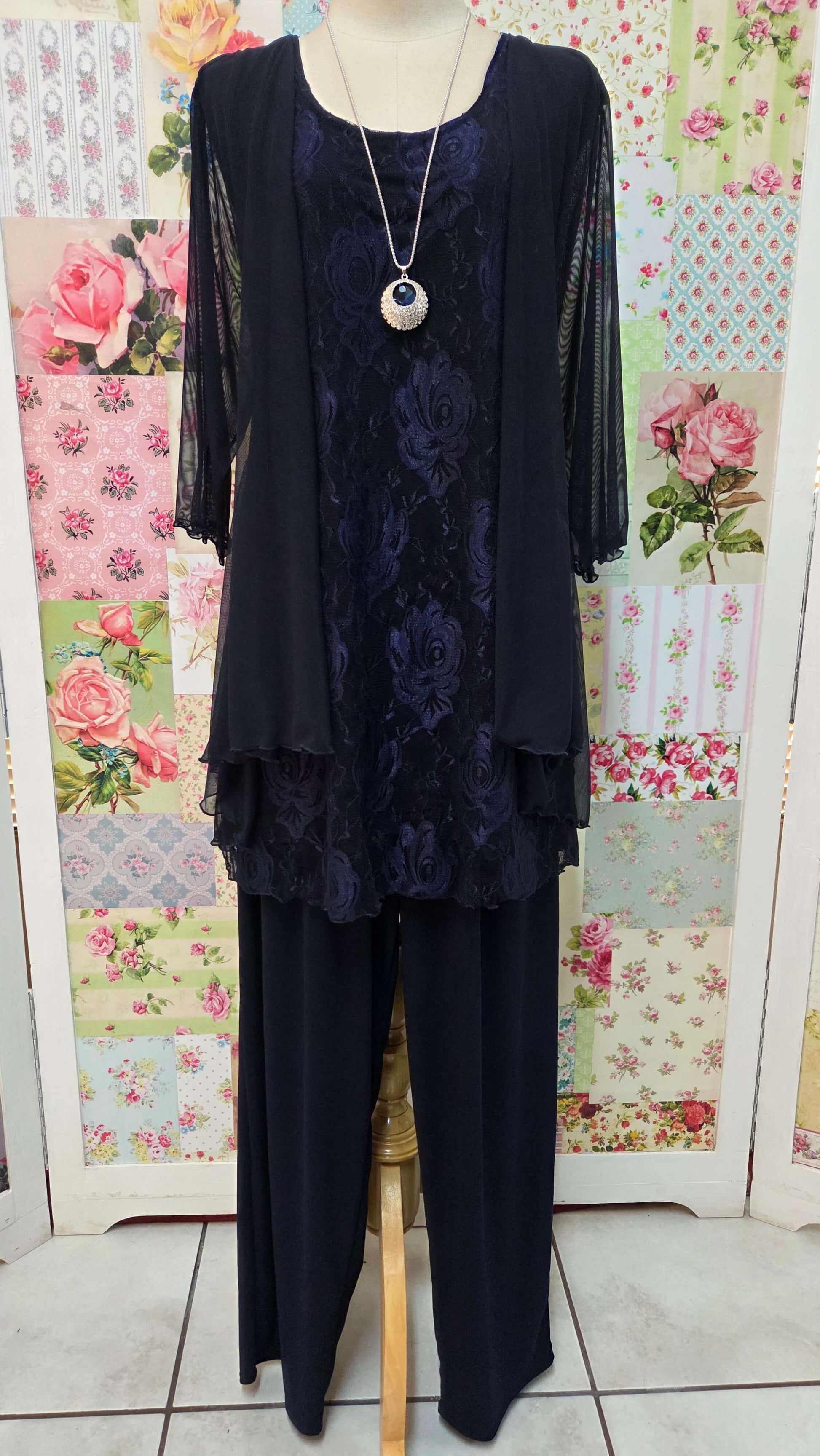 This elegant navy blue 2-piece set features a delicate lace top with false mesh front panels designed to resemble a flowing waterfall jacket, perfect for special occasions. The matching bonbon pants offer comfort and style with an elastic waistband, ensuring a flattering fit. Ideal for those seeking a sophisticated yet comfortable ensemble.