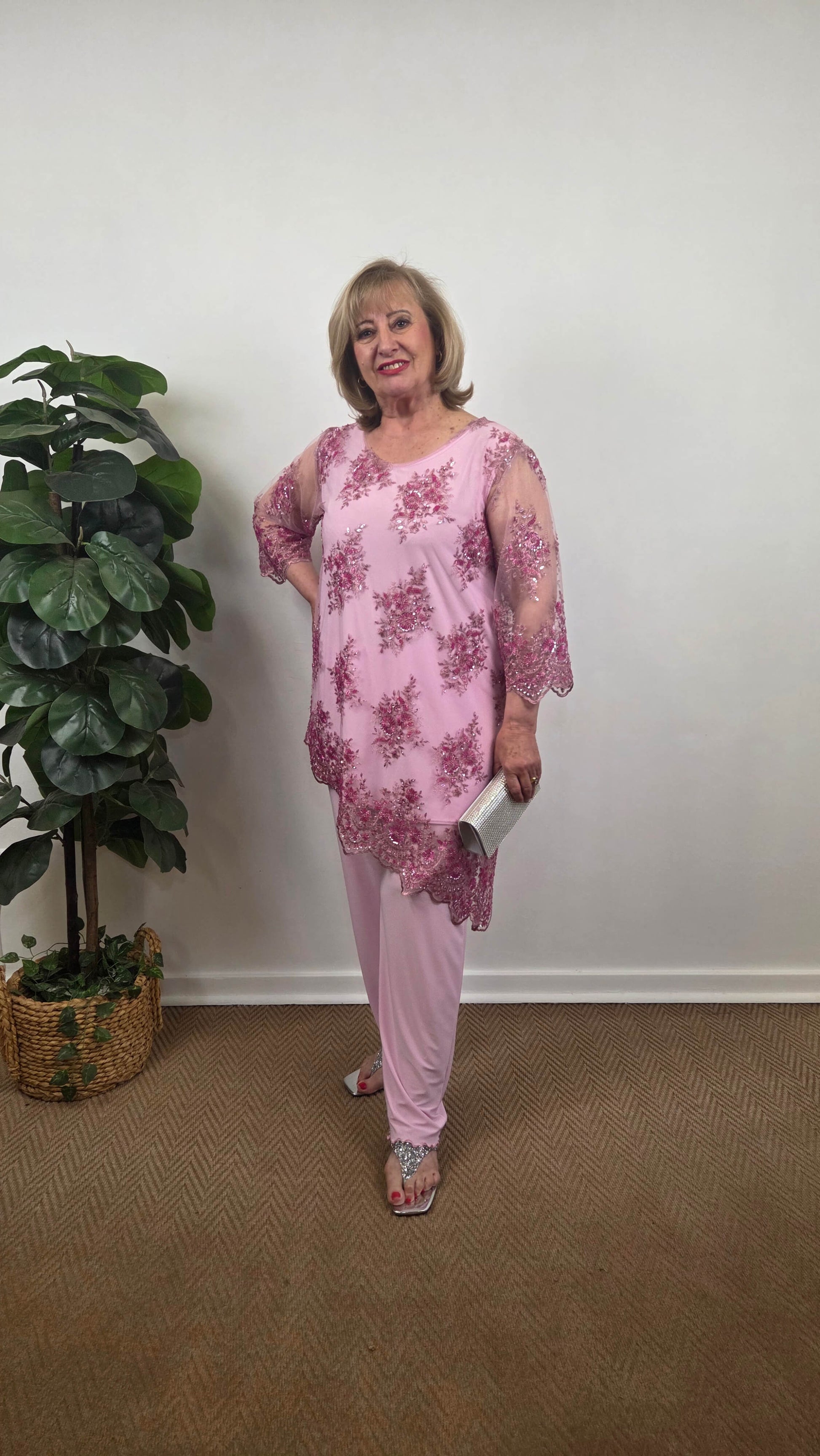 This 3-piece pants set is perfect for special occasions. The stunning pink lace diagonal top adds a touch of elegance, while the bonbon pants offer a comfortable fit. The included camisole completes the look. Elevate your style with this unique and stylish set.