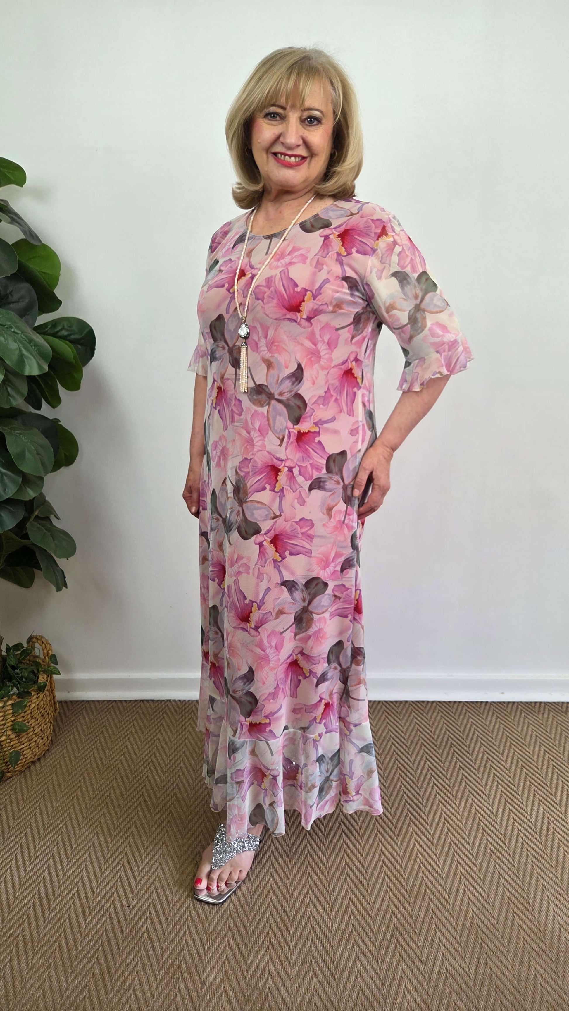 This elegant pink mesh dress features a delicate floral print and a soft lining for comfort. Designed with 3/4 sleeves finished with subtle frills, it also boasts a matching frill detail that enhances its feminine silhouette. Perfectly suited for special occasions, this dress combines sophistication with a graceful touch, ensuring you stand out with refined charm.