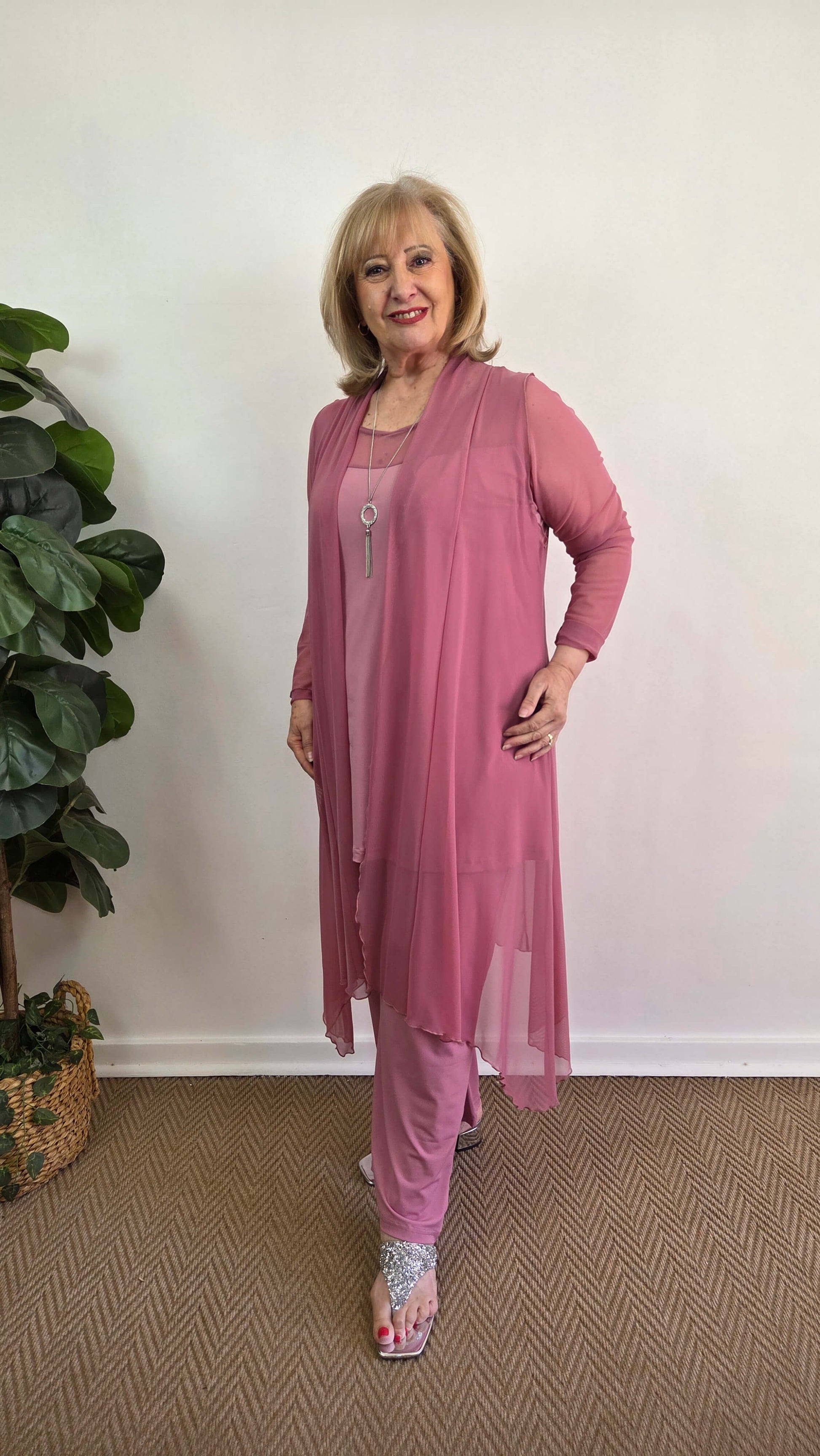 - Rose pink sleeveless mesh jacket with length of 121 cm from shoulder to longest point on jackets seam.