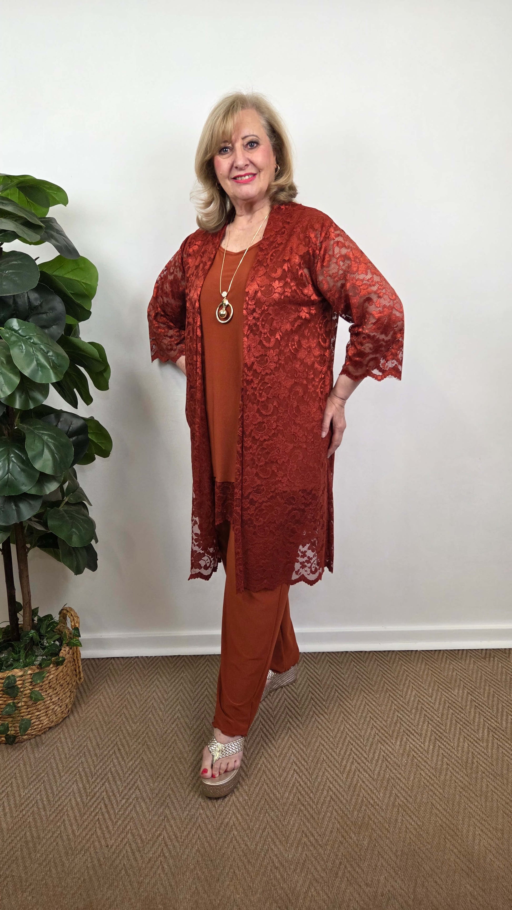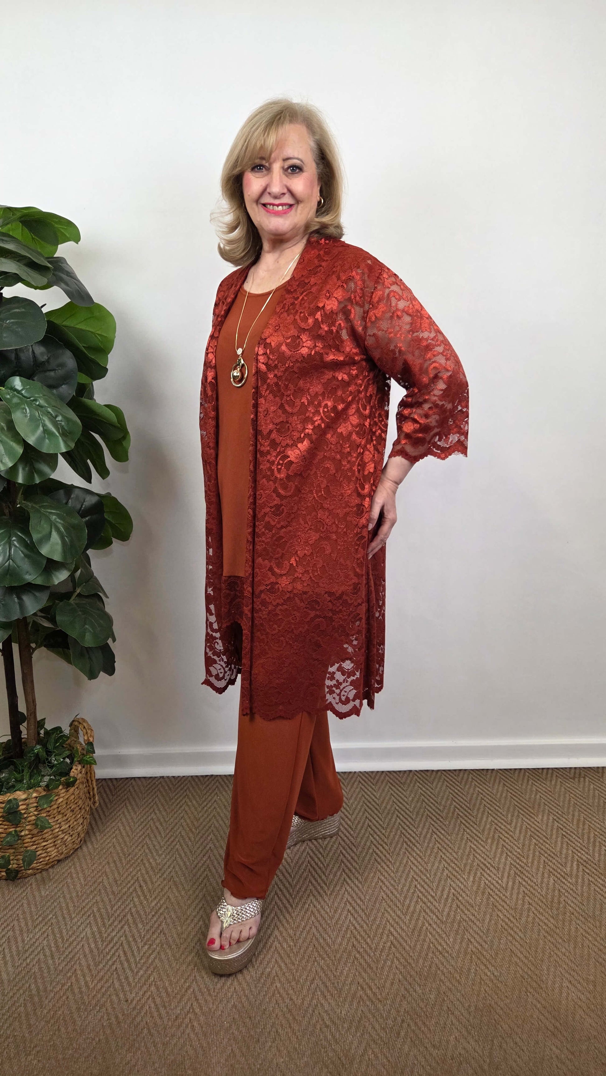 Elevate your style with our Rust Pants Set LR0648. Perfect for any special occasion, this set includes a stunning bonbon pants with elastic waistband and camisole, along with a delicate lace jacket featuring 3/4 sleeves. Look and feel beautiful with this must-have set.