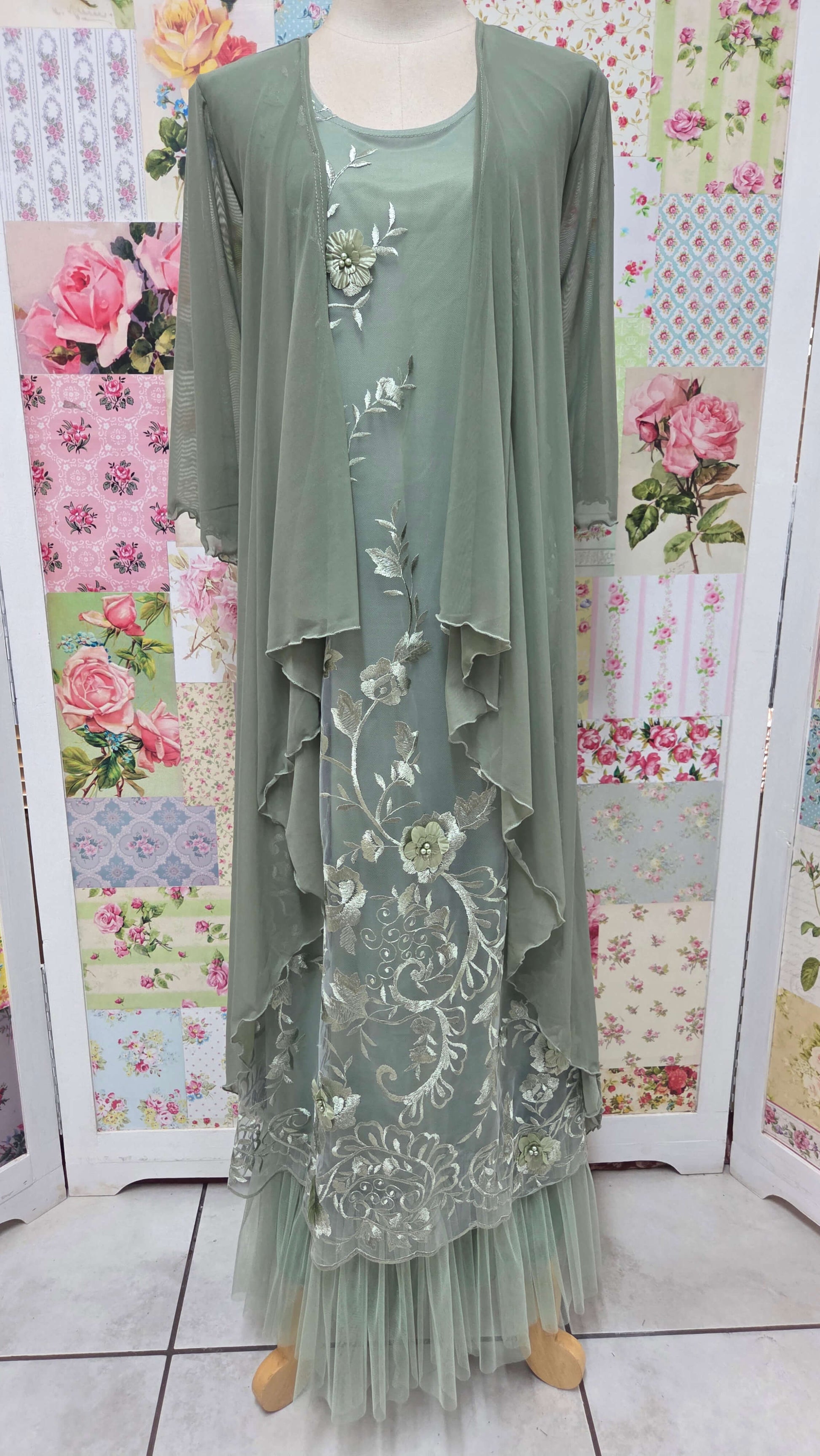 Elevate your special occasion wardrobe with this sophisticated sage green dress set. The sleeveless dress showcases delicate lace detailing on the front, while the back features elegant bon bon fabric for a refined silhouette. A mesh waterfall jacket with three-quarter sleeves completes the ensemble, adding dimension and versatility. The mesh frill adorning the hemline introduces a subtle textural element. Designed for weddings and formal celebrations, this coordinated set delivers polished elegance with thoughtful construction that balances intricate details with wearable comfort.
