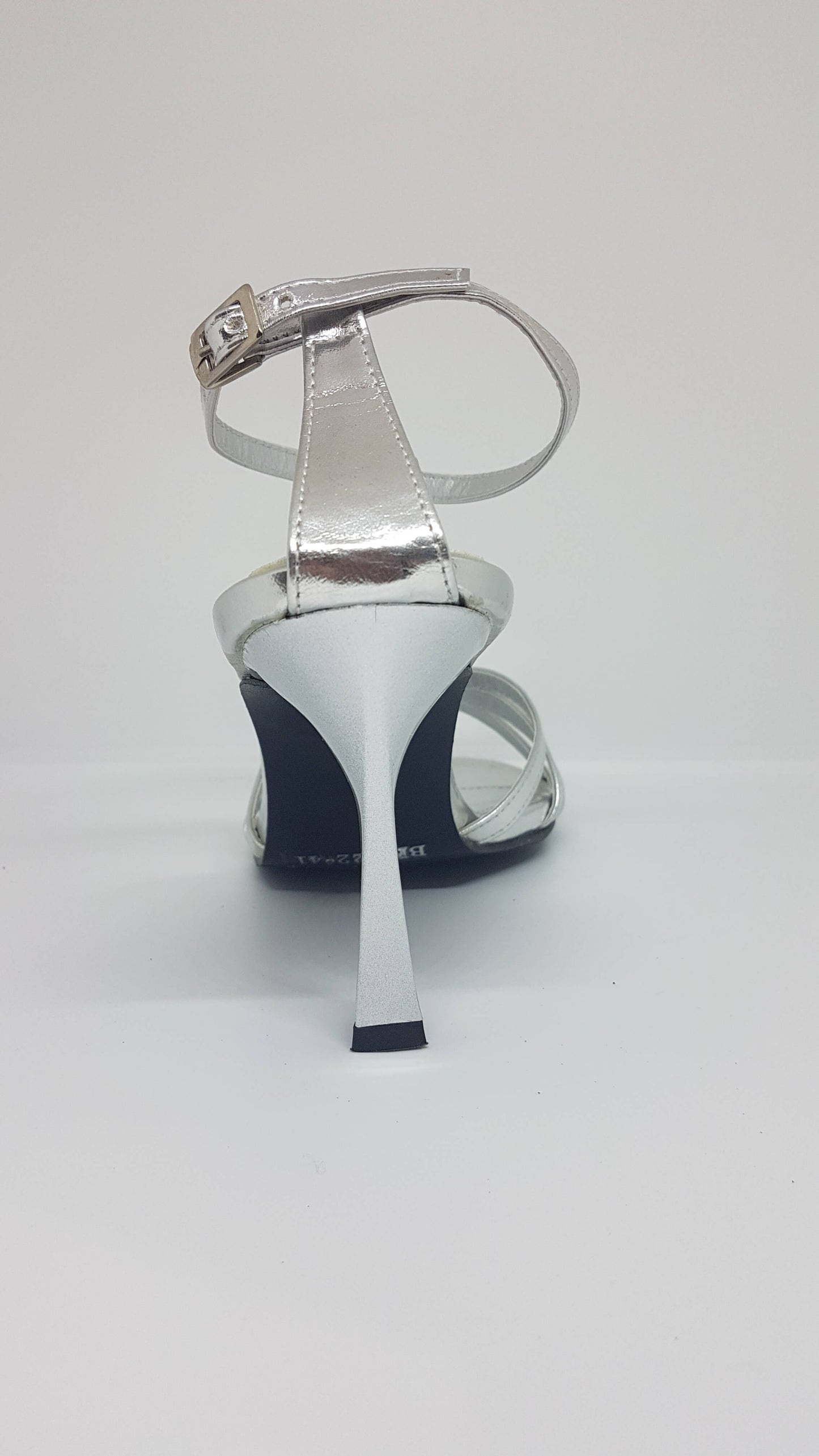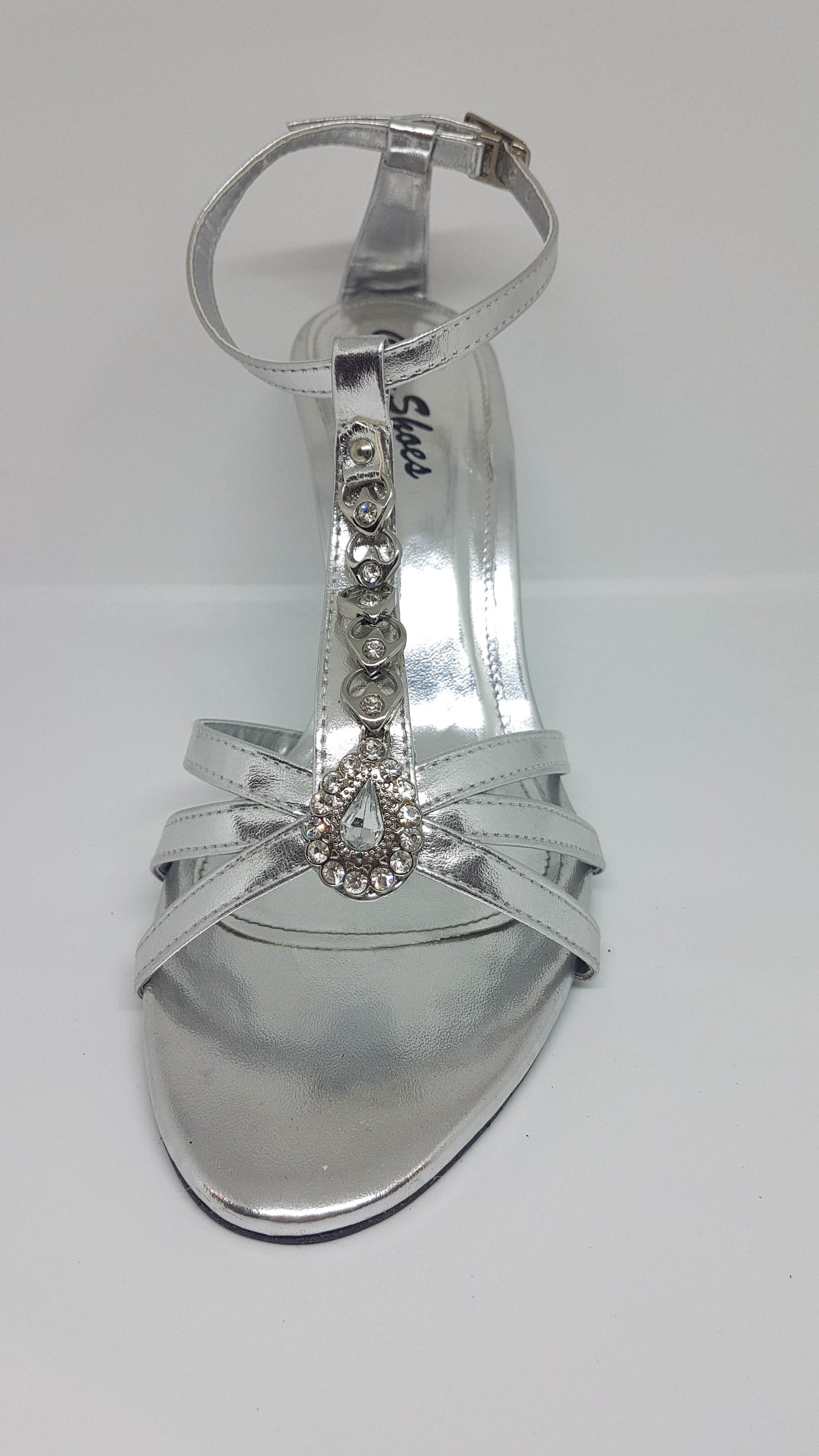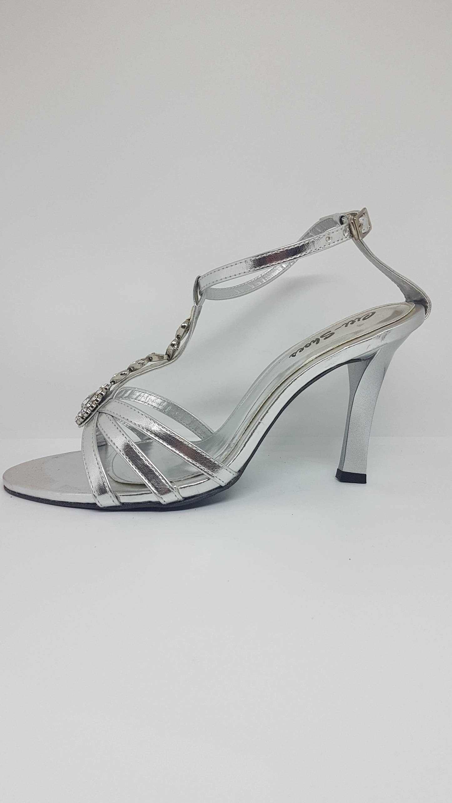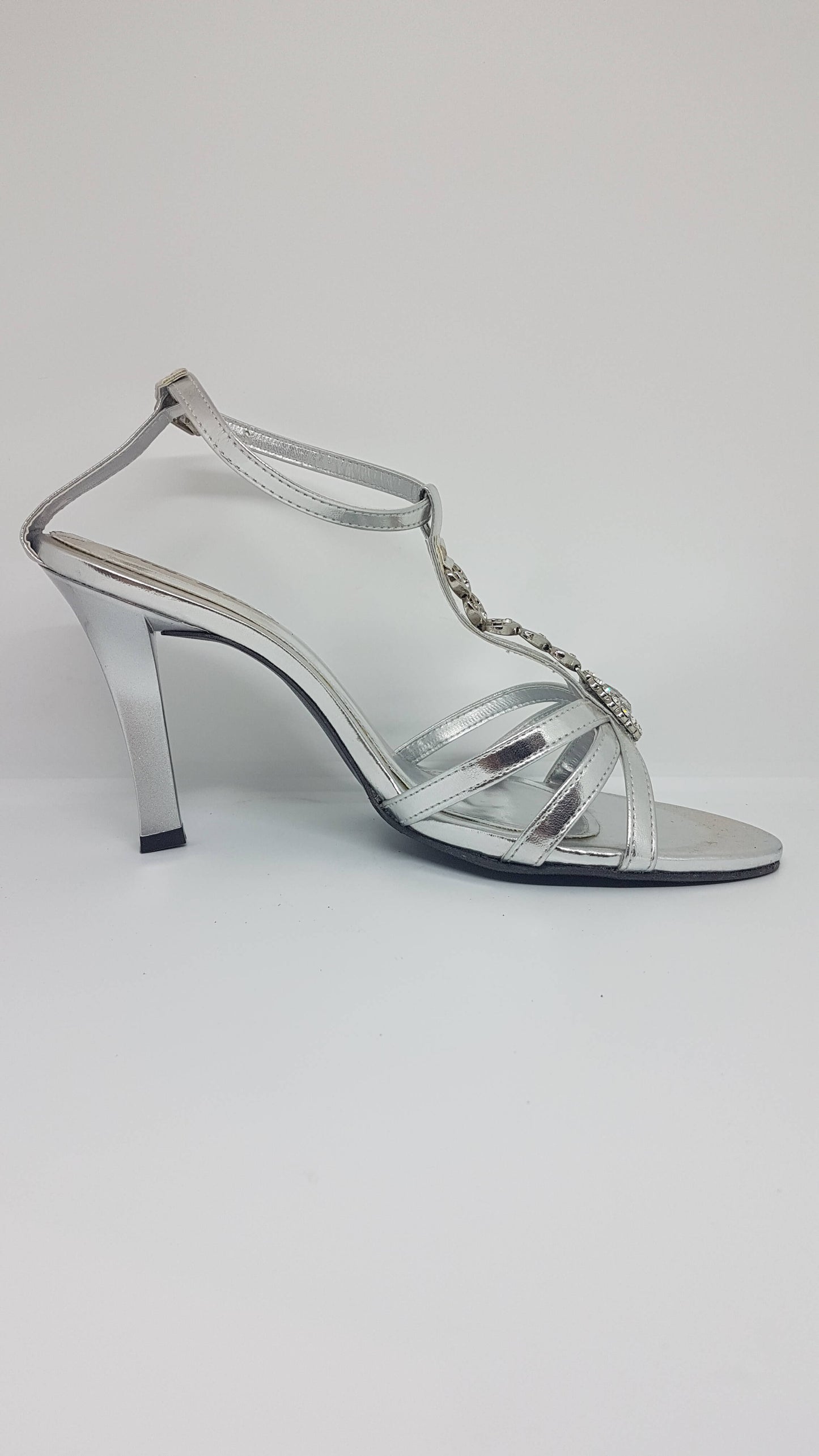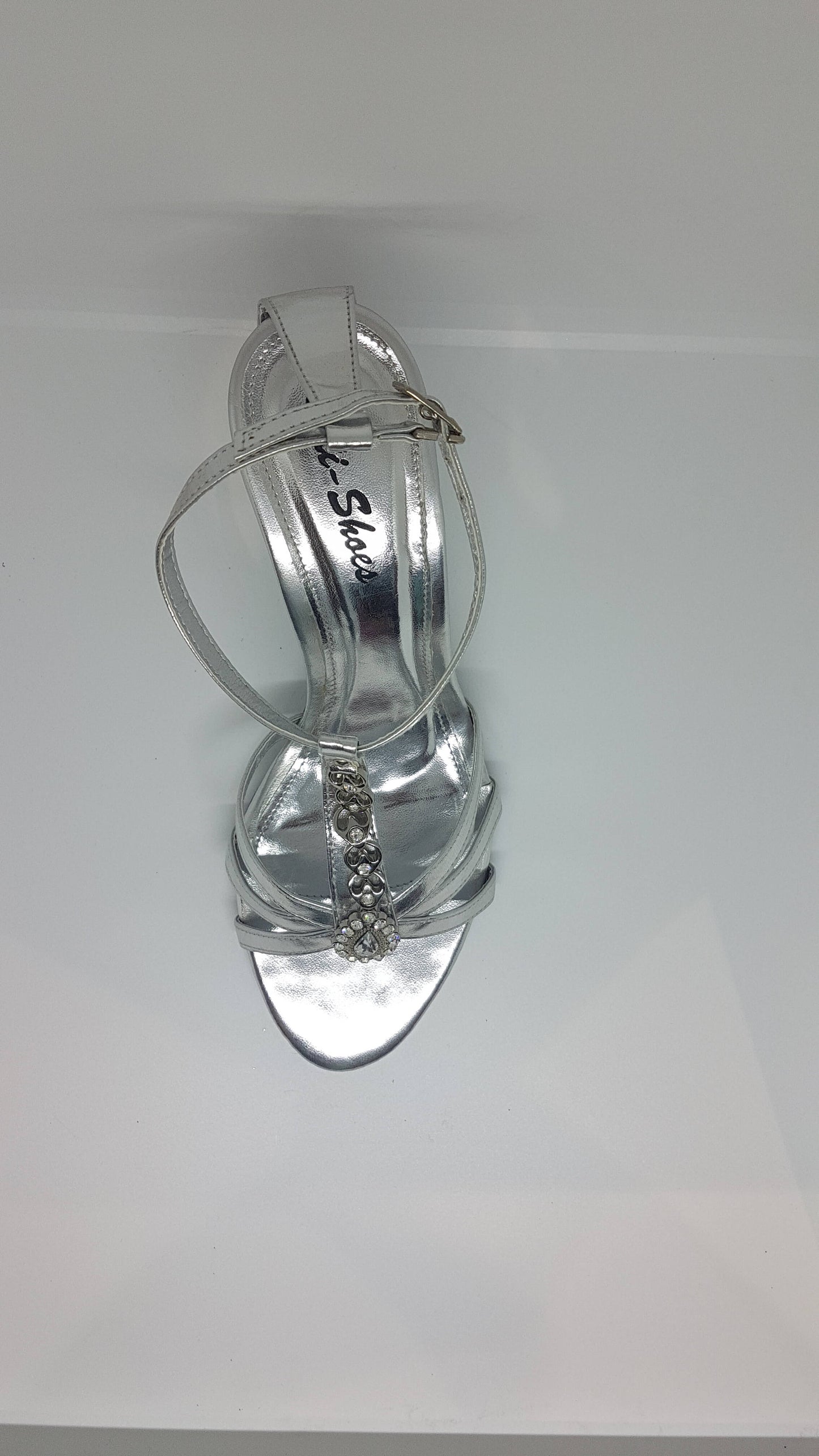 - Silver sandal with 3 straps and 1 big rhinestone detail in the middle.