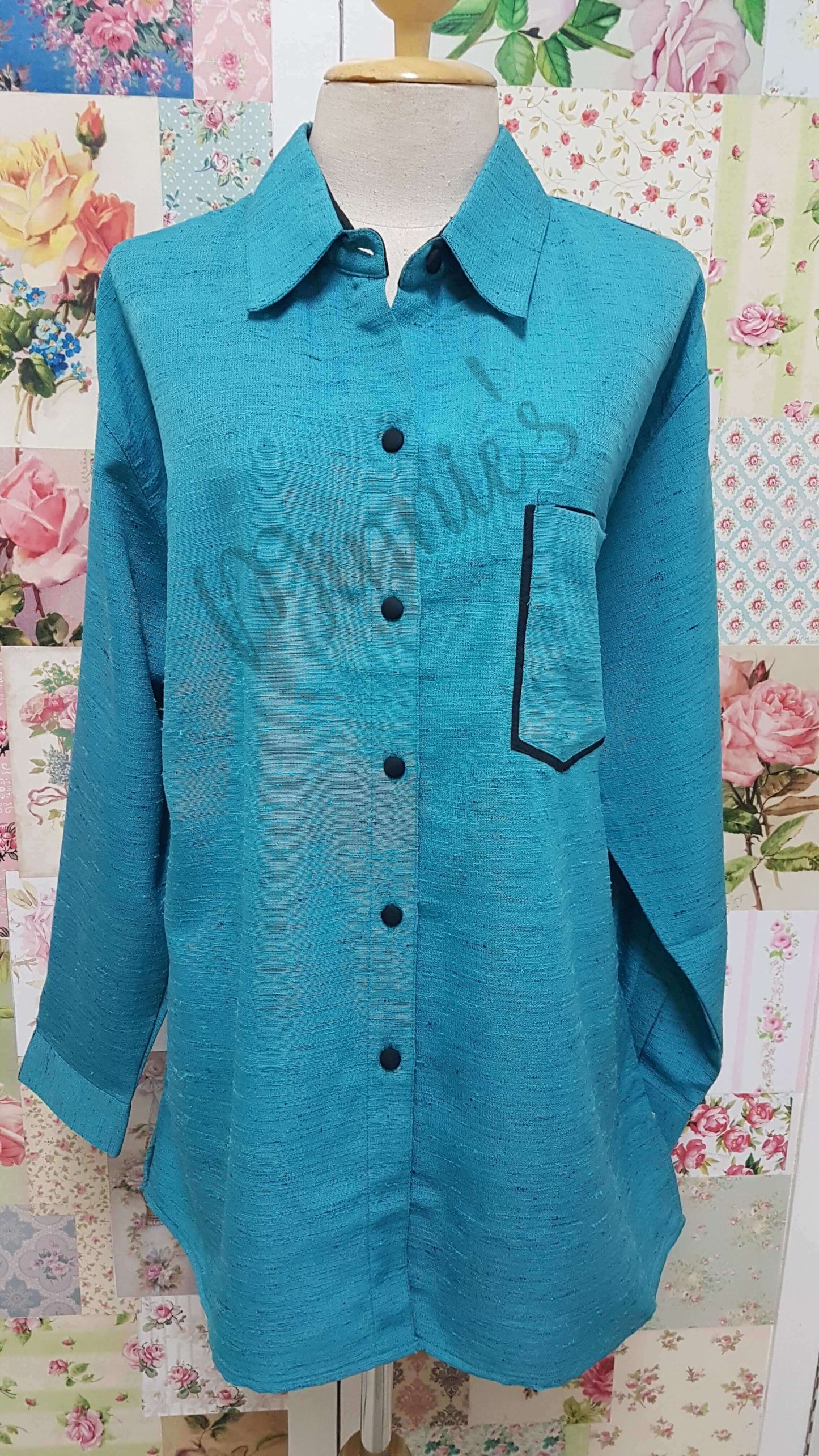 - Turquoise polyester long sleeve blouse with 1 pocket in front.